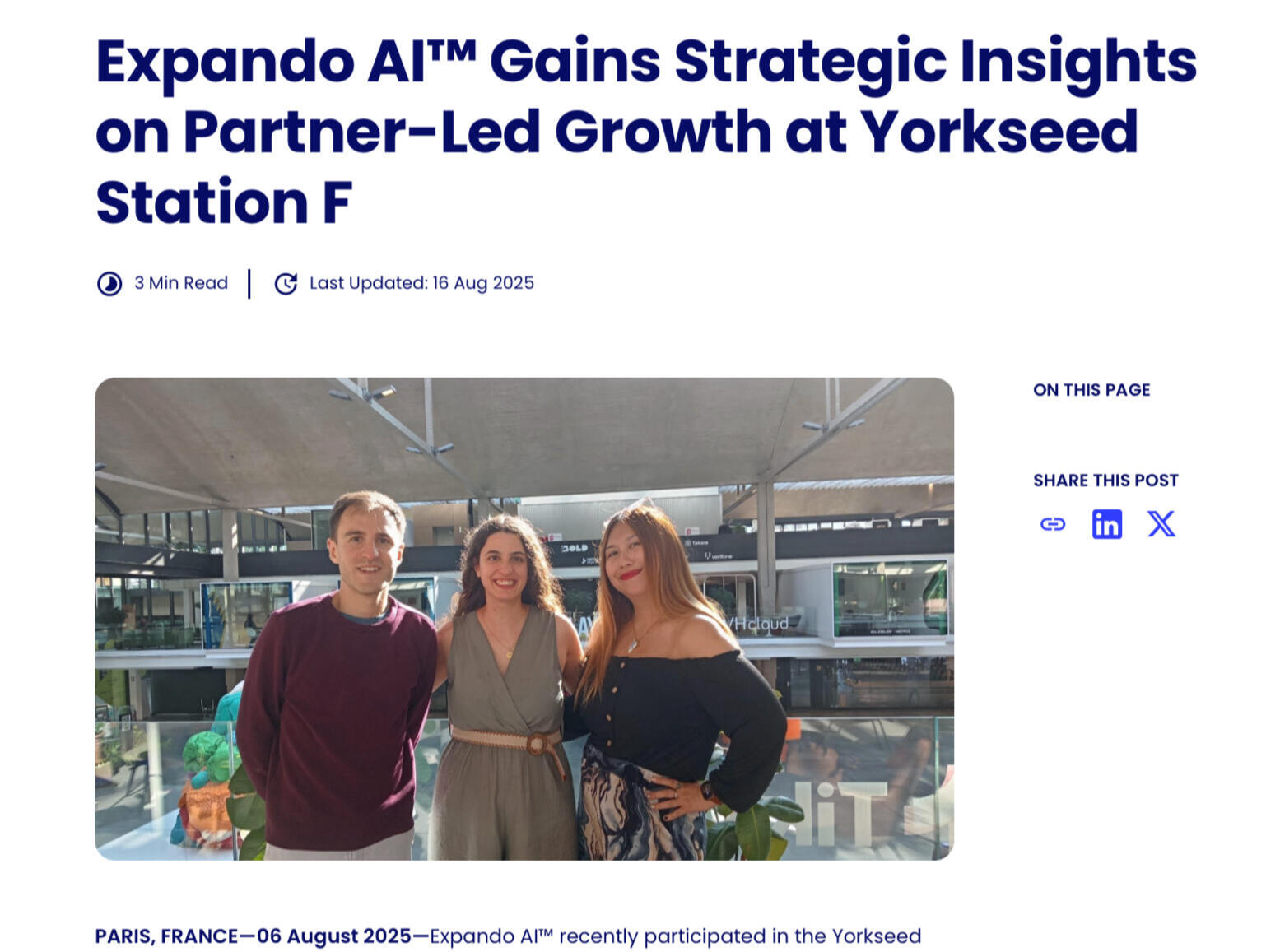 Expando AI™ Gains Strategic Insights on Partner-Led Growth at Yorkseed Station F (Paris, Aug 2025)Yorkseed™ hosted an intimate Station F Communal Lunch in Paris, bringing together international founders and innovators for strategic conversations on global growth, fundraising, and cross-cultural business challenges. Among the guests was Expando AI™ Co-Founder & CEO Xavier Roso, who shared insights on channel partnerships and international expansion while engaging with global builders in a collaborative setting. The gathering highlighted Yorkseed’s unique approach to curating high-value, founder–investor connections in trusted spaces.